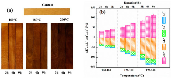 Figure 8a shows the surface color of the control and TM woods. The results showed that TM could induce remarkable color variations on the wood surface; higher temperatures and durations were associated with darker color. The variations of color parameters (ΔL*, Δa*, Δb*, ΔE*) before and after thermal modification are shown in Figure 8b. The ΔL* (lightness coordinate), Δa* (red/green coordinate), and Δb* (yellow /blue coordinate) were negative values derived from the difference values before and after thermal modification. Researchers reported that higher difference values indicated large color variation [4,57]. The absolute values of ΔL*, Δa*, Δb*, and ΔE* all increased with an increase of the severity of TM. The increase of the absolute value of ΔL* from −32.20 of TM-160-3 to −107.50 of TM-200-9 indicated a reduction of lightness. A similar trend was observed on Δa*, which increased from −7.23 of TM-160-3 to −23.25 of TM-200-9, resulting in the surface taking on a reddish color. The increase of the absolute value of Δb* from −1.85 of TM-160-3 to −6.86 of TM-200-9 resulted in the surface taking on a yellow color. The increase of total color differences (ΔE*) indicated the variation trend of surface color towards darker tones, which was in accordance with the color variation shown in Figure 8a.