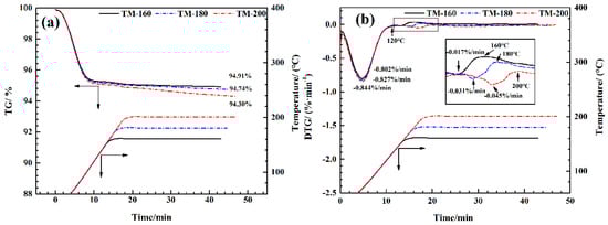As shown in Figure 9b, two distinct mass loss peaks were observed. The first indicates the dehydration stage (30–120 °C), resulting from the evaluation of free and bound water in wood [17,39]. With the increase of TM temperature from 160 to 200 °C, the mass loss rate at the first peak was slightly increased, i.e., 0.802% to 0.844%/min. The second peak was formed by the thermal degradation of hemicellulose and cellulose in the wood [50,67]. Higher thermal modification temperatures resulted in a wider temperature range of mass loss and in higher mass loss rates. For example, the temperature range of this peak increased from 120–160 °C to 120–200 °C, and the mass loss rate increased from 0.017% to 0.045%/min. The mass lost in this stage mainly transferred into small molecular weight gaseous components (CO, CO2, CH4 and H2O) and VOCs [3,50,52].