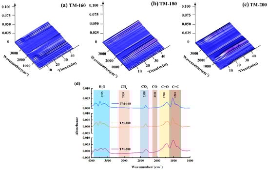 3D-FTIR analysis of wood thermal modification at different temperatures: (a) 3D-FTIR of TM-160; (b) 3D-FTIR of TM-180; (c) 3D-FTIR of TM-200; (d) 2D-FTIR at the points of maximum weight loss from the three thermal modification samples.