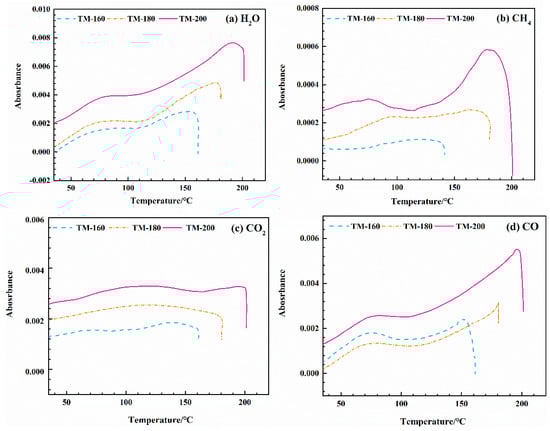 After the identification of components at characteristic infrared absorbance bands, the evolution of each detected gas component (H2O, CH4, CO2, and CO) was determined; see Figure 11. According to the Lambert-Beer law, the intensity of the absorbance of a characteristic infrared absorbance band is linearly dependent on the concentration of the evolved gas components [68,69]. As shown in Figure 10, the intensities of the characteristic infrared absorbance bands of four gas components gradually increased with the increase of thermal modification temperature. Among the four gas components, H2O had the highest absorbance intensity, i.e., 0.008, at a thermal modification temperature of 200 °C, followed by CH4, i.e., 0.006, CO, 0.0058, and CO2, about 0.0038.