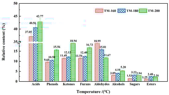 The relative contents of phenols increased from 9.6% to 15.56% at higher TM temperatures. Phenols were produced by the thermal degradation of lignin [26,31]. As shown in Table 2, trans-isoeugenol and (E)-2,6-dimethoxy-4-(prop-1-en-1-yl) phenol are the two dominant components in phenols, with relative abundances of 2.23−2.26% and 3.74−5.77%, respectively. These two components could be directly obtained from the cleavage of β–O–4 linkages in the lignin [25].
