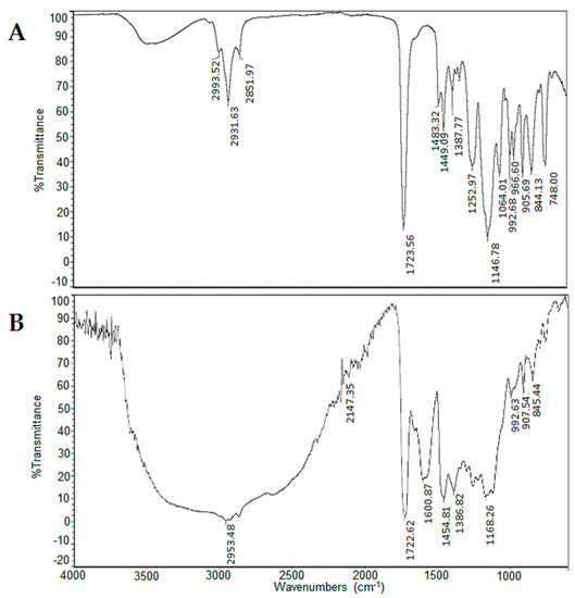 Comparative IR spectra poly(BMA–co–EDMA–co–GMA) unmodified (A) and functionalized with aminomethylated-calix[4]resorcinarene (5) (B).