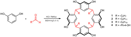 The preparation of calix[4]resorcinarenes has been reported elsewhere [30,34]. Hydrochloric acid (10 mL) was carefully added to a solution of resorcinol (10 mmol) and aldehyde (10 mmol), in a 1:1 ethanol/water mixture (40 mL). The reaction mixture was reacted at reflux with constant stirring for 1–6 h, subsequently cooled in an ice bath, and filtered and washed with water. Finally, the filtrate was dried under a vacuum and was characterized via spectroscopy techniques.