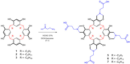 The preparation of benzoxazines from calix[4]resorcinarenes 1–3, formaldehyde, and β-alanine was performed using the following methodology: To a solution of calix[4]resorcinarene (1, 2 or 3) (1 mmol) in 44 mL of a mixture C6H6:EtOH (1:1), a solution of β-alanine (4 mmol) and formaldehyde (10 mmol) was added. The reaction mixture was reacted at reflux with constant stirring for 12–29 h. The product was filtered, washed with ethanol, and dried under a vacuum. The products were characterized via spectroscopy techniques.
