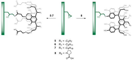 Reaction of calix[4]resorcinarenes 5–8 with glycidyl groups of copolymers. Chemical modification of the upper rim (left) and of the lower rim (right).