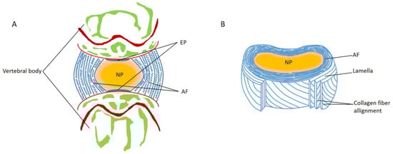 The main functions of the IVD are to transmit and absorb mechanical stress onto the spine and to maintain a mobile segment that allows flexion, extension, bending, and rotation [3,16]. Anatomically, a normal IVD can be roughly divided into the following three regions: (1) Nucleus pulposus (NP) with a gel-like core comprised of type II collagen and proteoglycans (Figure 1) [17,18]. NP cells are highly hydrated and account for the strength and mobility of the spine [19]. (2) Annulus fibrosus (AF) is a multi-layered fibrous tissue that surrounds the NP [20]. Unlike NP, AF is highly organized, consisting of stacked lamellae predominantly of type I collagen [21]. AF is required for transmitting stress from the NP, and maintaining the integrity of IVD and protecting it from injuries from bending, stretching, and twisting [22,23,24,25,26,27,28]. (3) End plates (EPs) are two hyaline cartilages that are enclosed, at the interfaces, by the superior and inferior vertebral bodies [29,30].
