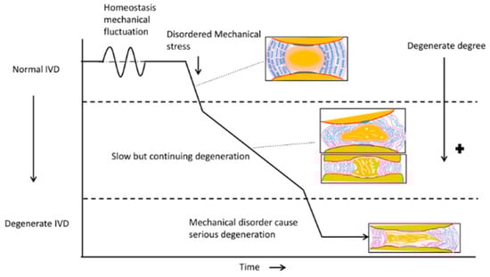 The altered biomechanics in IVD has been widely accepted as an important contributor to IDD because biomechanical loading directly affects IVD cell metabolism [31,32]. Macroscopically, overloading such as frequent bending and twisting [33], fatigue loading [34], and heavy physical work [35] raise a high risk of lumbar disc degeneration. While hypomobility, such as sedentary environment, also increase the intradiscal pressure depending on seated posture [36]. Herein, we define these aberrant altered biomechanics as disordered mechanical stress. NP stems from the axial notochord. In the embryonic stage, NP consists of notochordal cells (NCs), which gradually transform into chondrocyte-like cells (CLCs) post-embryonic and adult states [37]. A number of studies have shown that disordered mechanical stress can result in a loss of NCs, subsequently leading to IDD [38,39,40,41]. The alignment of collagen fibers is regulated by the orientation of cells in the AF, which are susceptible to mechanical stress [42,43,44,45,46,47,48]. However, disordered mechanical stress alters the structure of AF resulting from reorientation of, and that may impair the function of, AF and causes IDD. Besides NP and AF, angiogenesis is another constant feature of IDD [49] and disordered mechanical stress supported angiogenesis by inducing vascular endothelial growth factor (VEGF) [50]. Taken together, disordered mechanical stress may become another reason for IDD besides biochemistry, except for the common concept of biochemistry factor. Because disordered mechanical stress mainly induces the structure pathological changes of NP and AF, further results in the loss of mechanical function of IVD. Strategies for restoring the structures of NP and AF are essential in the clinical trials.