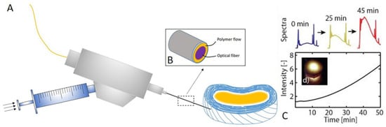 (A) Customized minimally invasive surgical probe used for hydrogel implantation. Liquid hydrogel precursor injection and illumination are performed by a single needle cannula. Different joints ensure high pressurization during the injection. An optical fiber permits the light delivery for photopolymerization. (B) Representation of the distal tip of the instrument, the hydrogel precursor flows between cannula wall, and optical fiber into the IVD. (C) By recording the reflected illumination spectra, signal intensity is calculated. The intensity of the signal correlates with the amount of photopolymerized material and, therefore, provides valuable information on the reaction state of the implant in real time.