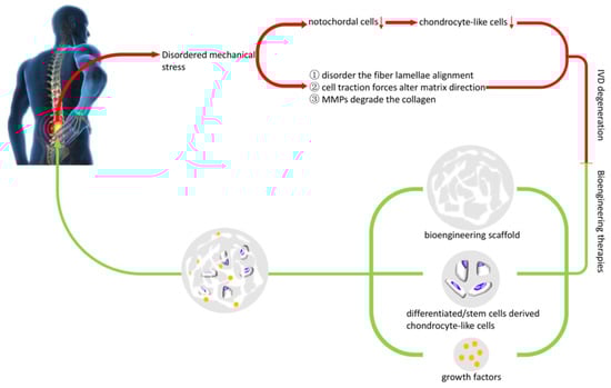 Evidence is accumulating on the use of tissue engineering strategies for treating IDD [51,52,53,54]. Various tissue-engineered scaffolds with feasible substances (e.g., functional cells, growth factors, proteins, peptides, etc.) are being applied in IDD therapy, achieving significant curative effects. In this paper, we will discuss the effect of disordered mechanical stress on NP, AF, and angiogenesis, and the current tissue engineering therapies in IDD. We expect that this review will support a new direction to an understanding of IDD mechanism and therapy application.