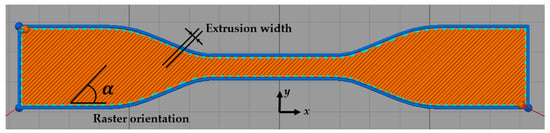 Among these process parameters, raster orientations (the direction of the raster pattern relative to the loading of the part, usually in either unidirectional or crisscross patterns) and extrusion width (also known as raster/bead width, defined as the width of the raster pattern) are extensively recognized as two of the main aspects affecting the porosity and mechanical behavior of the 3D printed products [19,21]. Thus in this study, we had selected raster orientation (in terms of raster angle with respect to the x-axis) and extrusion width as the parameters to vary in the FDM process. The parameter values of interest were categorized into five sets given in Table 1, where three specimens were printed for each set of process parameters to study the variations of the FDM process. An illustration of raster angle and extrusion width from Simplify3D toolpaths is shown in Figure 1. The layer thickness was fixed as the commonly used value 0.2 mm, the infill density was fixed as 100% for all the sets to ensure a dense structure giving rise to sufficient material strength and a retraction vertical lift for the extrusion nozzle was set as 0.6 mm to avoid the nozzle scratching the previously deposited layer during movement. The other process parameters remain untouched as the default values: Nozzle temperature 67 °C, platform temperature 210 °C, infill pattern rectilinear, printing bed speed 40 mm/s, to name a few.