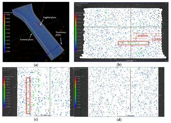 To better visualize the pore distribution, the three-dimensional XCT image in Figure 5a was mapped to transverse, sagittal, and coronal planes, respectively, as illustrated in Figure 5b–d. The two-dimensional images showed clearly that the large population of pores with small sizes below 0.2 mm had irregular shapes. It is noteworthy that the large pores tended to have more regular shapes (ellipsoid-like or cuboid-like) and tended to appear in a linear array between two pairs of the 0°/90° crisscross layers, as illustrated in Figure 5b. This denotes that the large pores may have been caused by the imperfect bonding between adjacent pairs of the crisscross layers.