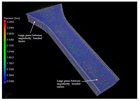 Three-dimensional visualization of pore distribution for UPL = 3.6 mm. Representative large pores between the imperfectly bonded layers and rasters are highlighted.