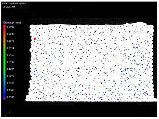 It was also clear that the pore size distribution for the three UPLs was quite similar, although the analysis with the limits of 1.8 mm and 3.6 mm captured a very small amount of large pores which were not quantified by the limit of 1 mm. The spatial locations and size distributions of the pores for UPL = 1 and 3.6 mm, respectively, are shown in the three-dimensional XCT images in Figure 5a and Figure 6. It was visualized that the pores were densely distributed over almost the whole PLA specimen—this was not surprising considering that the thermoplastic filament was highly affected by the heating and cooling iterations during the printing process. Clearly the porosity analysis with UPL = 3.6 mm captured a number of larger pores presenting between the bonded layers and rasters, which were probably induced by the imperfect bonding but were not captured by the analysis with smaller UPL.