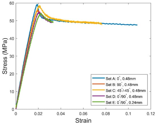 From the statistical analysis, the mechanical properties characterized by the tensile tests are presented in Table 7 in terms of the mean and standard deviation of the three specimens in each set of process parameters. Correspondingly, the stress–strain curves for the representative specimen in each set are given in Figure 8. At first glance, the 3D printed PLA material exhibited significant anisotropic behaviors in the tensile properties. By selecting the different raster orientations in the printing, the percentage differences of the Young’s modulus, ultimate tensile strength, and the strain at fracture for the specimens respectively reached 17.5%, 10.8%, and 70.4%. The highest anisotropy existed in the mechanical properties between set A and set B, as well as set C and set D. More specifically, specimens printed in 0° and 45°/−45° raster orientations had obviously higher elastic modulus, ultimate strength, and ductility compared to those in 90° and 0°/90° orientations. The anisotropy is not surprising if we look back on the porosities presented in Table 4 and Table 5—the PLA materials printed in 90° and 0°/90° orientations had larger porosities (as well as more pores) compared to the ones in 0° and 45°/−45°, and therefore gave rise to stronger stress concentrations which led to weaker mechanical properties. Similarly, as expected, the tensile tests showed that the specimens printed with a 0.48 mm extrusion width (having lower porosity and less pores) exhibited better mechanical properties compared to those printed with a 0.24 mm extrusion width.