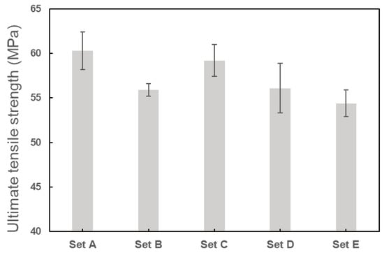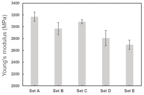 The variations for Young’s modulus, Poisson’s ratio, and ultimate tensile strength for the three specimens in each set were quantified using standard deviations in Table 7. The Poisson’s ratio was observed to vary very little for the three specimens in each parameter set. Also, the mean value of Poisson’s ratio in each parameter set was approximately equal to 0.33, which was almost independent of the process parameters. The coefficient of variations of Young’s modulus and ultimate tensile strength was, respectively, up to 4.6% and 5.0%, both of which were considered reasonably accepted. The variations of Young’s modulus and ultimate tensile strength are illustrated in Figure 9 and Figure 10, respectively.