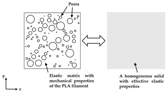 A micromechanical finite element model is proposed in this section to predict the elastic properties of 3D printed PLA material based on the actual microscopic details of the pores characterized by XCT. The model was developed through an two dimensional analysis of a periodic representative volume element (RVE), a micromechanical technique widely used in the literature for estimating the macroscopic behavior of composites which consist of a matrix containing microscale inhomogeneities, such as pores or fibers [10,29,30]. The identification of such a composite material into an RVE is not unique. One popular identification method is to assume that the inhomogeneities are uniformly distributed in the matrix and have the same geometry [31,32]. This method is easy to implement but clearly not adequate for quantifying the size distribution and the spatial location of pores in FDM processed materials.
