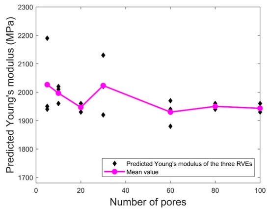 To predict the elastic properties using the proposed micromechanical model, the first step is to check the minimum number of pores for homogenizing the effective Young’s modulus and Poisson’s ratio of the RVE. More specifically, the pores in the RVE should be sufficient for representing the microscopic details in the 3D printed PLA material; however, the number of pores should be as small as possible to ensure an economic computation.
