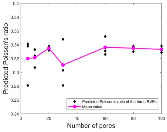 To determine the minimum number of pores in each RVE, statistical simulations were conducted using the pore size distributions following Table 8 to evaluate the elastic properties for the specimens with the selected porosity between 3% and 50% and the number of pores between 5 and 100. Figure 12 and Figure 13, respectively, show the variations of the representative predicted Young’s modulus and Poisson’s ratio of the three RVEs in set A for different numbers of pores and porosity = 20%. Also included are the mean values of the elastic properties of the three RVEs for each value of N. It was observed that the mean values of both elastic properties did not change very much as the number of pores reached 80. Moreover, for the number of pores below 80, the variation of the elastic properties for the three RVEs was much more serious compared to the corresponding data for N = 80 and 100. This indicates that 80 pores in the RVE may be sufficient for homogenizing the predicted Young’s modulus and Poisson’s ratio. For the following results, we use N = 80 in the RVE to predict the elastic properties.