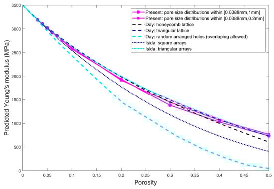 For our micromechanical model, the predicted elastic properties are expected to depend on the porosity as well as the pore size distributions [37]. Thus, apart from the pore size distributions described in Section 3.3.1, here we consider one more distribution of the pore sizes in the RVE for a more comprehensive study. As indicated in Table 6, over 99% of pore sizes fell into the range below 0.2 mm. To capture the large population of the smaller pores, we assumed all of the 80 pores in the RVE to have sizes between 0.0388 and 0.2 mm. The prediction results were compared with the RVE analysis using the full range of the pore sizes (between 0.0388 and 1 mm) selected as in Table 8 as well as the two existing numerical works. As before, three RVEs were generated for each type of pore size distribution and each porosity for N = 80.