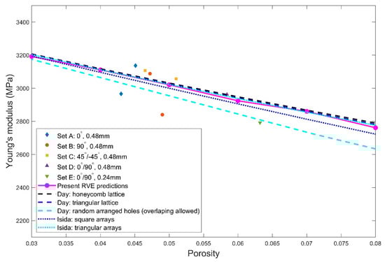 Comparison of the predicted Young’s modulus with the experimental data against porosity for the five sets of specimens (with various combinations of raster orientations and extrusion widths). The results from the existing numerical models in [35,36] are also included for reference.