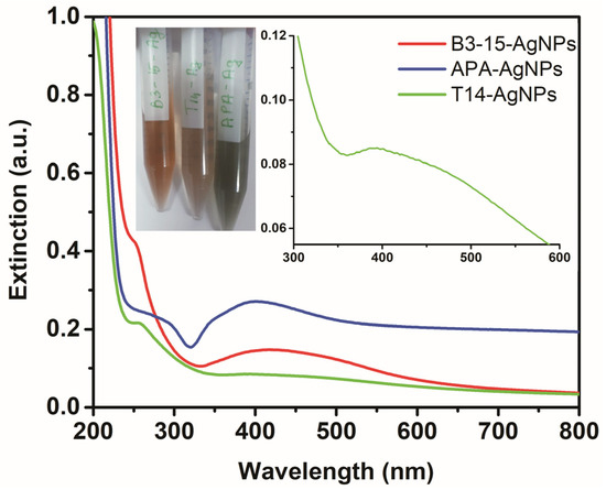 Extinction spectra of EPS B3-15-Ag NPs (red), γ-PGA-APA-Ag NPs (blue) and EPS T14- Ag NPs (green), with photographs of the three samples. The inset reports a magnification of the band at 394 nm of EPS T14-Ag NPs.
