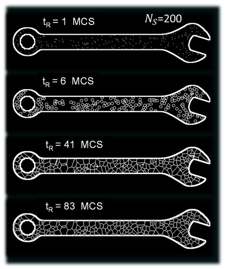 Evolution of the cellular structure within the design domain as a function of Monte Carlo steps for a fixed number of seeds (NS = 200).