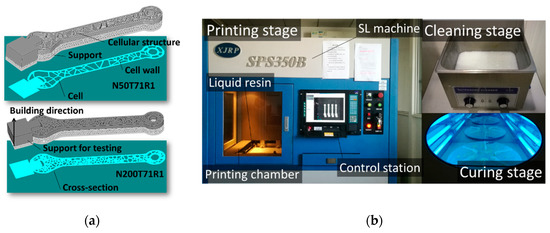 (a) Example of two CAD (Computer-Aided Design) models representing cellular designs of a wrench and their conversion into sliced objects for stereolithography. Sample nomenclature includes number of seed points N, relaxation time T and replicate number R, (b) Main steps of manufacturing using stereolithography equipment.