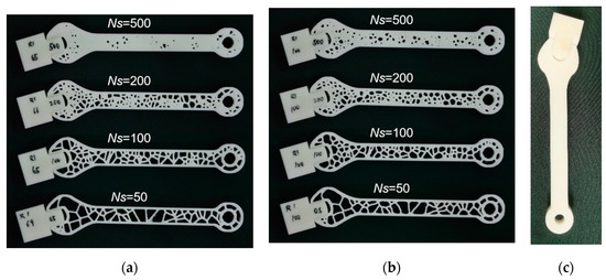 The generation of cellular structures based on Voronoi–Monte Carlo approach can be also extended to the design of technical parts for the purpose of weight saving (Figure 14). The definition of the design domain from a typical stl file can be performed, as shown in Figure 14, by excluding some regions where fully solid material is needed. The regions to be excluded can be decided based on mechanical criteria issued, for instance, from finite element computation. In the example shown in Figure 14a, these excluded regions correspond to the joining blocs. The generation of the Voronoi-like structure in Figure 14a is performed with 100 seed points. The smaller the number of seed points, the larger is the weight saving performance in the central part. Further development of the structure at the Monte Carlo stage allows also the control of the weight saving process by increasing the number of Monte Carlo steps as shown in Figure 14a. At a characteristic time of 100 MCS, more cells are eliminated by the cell growth process compared to the time of 20 MCS. The corresponding the cellular structures in Figure 14b are generated by a two-neighbor connectivity scheme. This scheme maintains a strong connectivity between the joining blocs even with a reduced number of seed points or with a long Monte Carlo stage. The Voronoi-based and the Monte Carlo–Voronoi based cellular designs offer different types of load bearing capabilities ranging from bending dominant to uniaxial dominant behaviour. Figure 14c shows the slicing step for both Voronoi-like and Voronoi–Monte Carlo-like cellular parts. The solid volume for these two parts is 17 cm3 and 14 cm3, respectively. The manufacturing requires a support volume of 2.41 cm3. This support material represents only 14%, and 16% of the solid volume for Voronoi-like and Voronoi–Monte Carlo-like cellular parts, respectively.