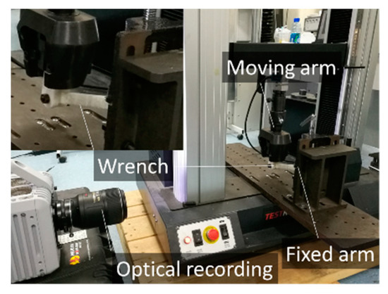 The solid and cellular wrenches are subjected to bending testing using an electromechanical universal test machine from Testresources Inc. (Shakopee, MN, USA) equipped with a load cell of 100 kN (Figure 4). Testing is conducted until the rupture of the wrench or the support. The moving arm is displaced with a constant rate of 10 mm/min. Optical recording is performed during the wrench deformation using a CMOS camera (Fastcam SA-X2 from Photron company, Tokyo, Japan). The acquisition is performed using a resolution of 2448 × 2048 pixels (pixel size is 71.43 µm) and a frame rate of 50 fps (frame per second).