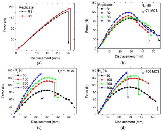 Result of bending experiment of 3D printed (a) fully solid and (b–d) cellular wrenches expressed as force–displacement curves for different (b) replicates and varied number of seed points NS combined with two relaxation times tR, (c) 71 MCS, (d) 100 MCS.