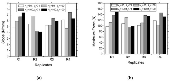 In order to validate this statement, the slope and maximum force of the four replicates are examined in Figure 8 for all printing conditions. It can be seen that the leading effect of the number of seed point is confirmed. However, the randomness of the distribution does not allow a reproducible behaviour as the tendencies for both the slope and the maximum force of all replicates are significantly different. It can be also argued that Monte Carlo relaxation adds more complexity in the final result as the dispersion obtained is significant between = 71 MCS and = 100 MCS.