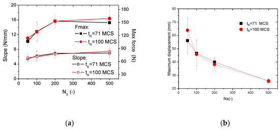 Main extracted mechanical parameters from the bending test: (a) slope and maximum force, (b) displacement at break as a function of the number of seed points NS and relaxation times tR.