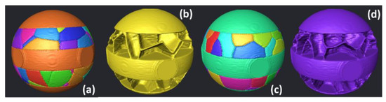 Figure 11 shows the use of the exclusion concept in some parts of the design domain. By referring to the former example of spherical shape domain, three regions, where solid structures are needed, are excluded. This means that the initial position of the seed points is attempted elsewhere. Figure 11a shows the final design after a Monte Carlo process performed with 100 seed points. The selection of the cellular structure differs in this example with respect to Figure 10b as the boundaries of the cells are selected if at least these separate two cells. This means that the final structure in Figure 11b contains in the design domain close-cell structure by opposition to the open-cell structure in Figure 11b. Further growth of the cells (Figure 11c) by a large amount of time (70 MCS in this example) allows the formation of larger curved cells. The conversion of the design into a cellular structure based on two-neighbor boundary cell walls form a bending dominant structure (Figure 11d).