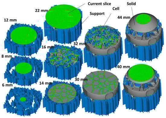 Figure 12 shows the slicing step of the cellular structure in Figure 11d prior printing using stereolithography, where the scaling is adjusted to obtain a part diameter of 40 mm. The cross-section at depths 16 and 32 mm illustrates the requirement for internal support material to withstand the formation of the cellular structure. At the depths of 14 and 30 mm, the curvature of the cells generated from the Monte Carlo process is clearly depicted. At these particular depths that mark the limit between the cellular structure and the solid part, there is no need for an internal support material. The manufacturing step and the final rendering of the structures are illustrated in Figure 11b,d.