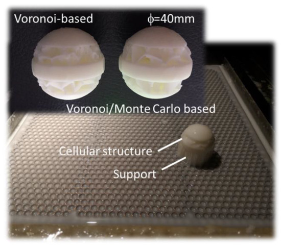 The manufacturing time for both structures is 137 min. The volume of the solid part is 19.98 cm3 and the cellular structure built using the Voronoi–Monte Carlo scheme exhibits a relative density of 0.60. The volume of the support material is 8.77 cm3, which represents nearly 44% of the solid part (Figure 13).