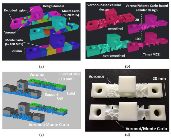 Extension of the Voronoi–Monte Carlo approach to the design of technical parts, (a) The generated Voronoi 3D structure based on 100 seed points and subsequent Monte Carlo structures at two different time steps (MCS), (b) the cellular designs achieved at different stages including the Voronoi-based and the Voronoi/Monte Carlo-based, (c) slicing and (d) 3D printed designs using stereolithography.