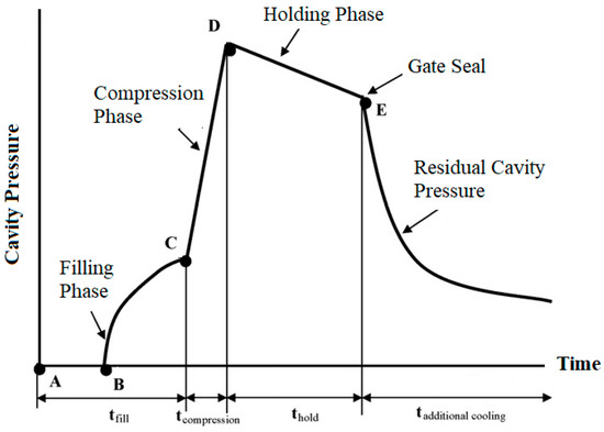 Injection molding has been broadly used to fabricate components in many industries, such as in automobiles, electronics, sports goods, medical devices, and optical lenses. Injection molding is a cyclic process that comprises of four stages: (1) mold closing and clamping; (2) filling, compressing, and holding; (3) cooling and concurrently plasticizing for the next cycle; and (4) mold opening and ejecting. In stages 2 and 3, the filling, compressing, holding and cooling of molten polymer within cavities have been paid much attention in past studies, since they determine the quality of the injection molding parts [1,2,3]. Particularly, this includes main process parameters such as injection speed and pressure, holding pressure and time, melt and mold temperatures dominate the injection molding qualities, e.g., part appearance, geometrical dimensions, mechanical properties, etc. The behaviors of molten polymer within cavities can be observed by investigating the cavity pressure profiles [4]. Figure 1 shows a typical cavity pressure profile, the pattern from Point A to C represents the filling stage, in which molten polymer enters the mold cavities, following this the cavity pressure is gradually increased based on the injection pressure applied. The filling phase is completed at Point C, where the cavity is only volumetrically filled by the molten polymer without being compressed. The compression process then begins, and the pressure increases rapidly to its peak value at Point D, which has the greatest impact on the resisting mold clamping force introduced by the clamping mechanism in the whole injection molding process. The molten polymer within the cavity is then maintained at a set pressure during the holding phase. Additional molten polymer can be packed into the cavity to compensate for the plastic shrinkage caused by cooling, thus ensuring that the mold is completely filled. This process continues until the gate is frozen, as shown at Point E. This is followed by the final cooling phase, and it continues until the end of the cycle. During this phase, the melt solidifies gradually as the coolant that circulates within the cooling channels in the mold removes heat. The cooling and solidification rates determine the rate while the cavity pressure decreases.