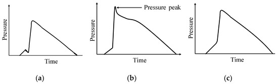 Patterns of cavity pressure profile affected by the V/P switchover timing. Pattern (a), Pattern (b), Pattern (c).