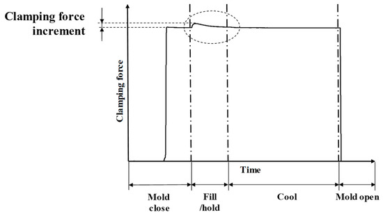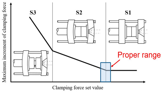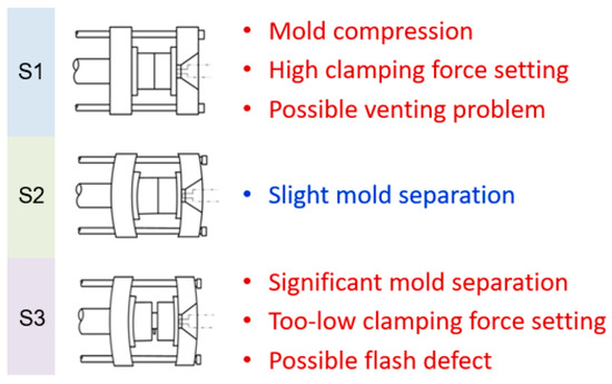 As molten polymer fills the cavity, the cavity’s pressure increases. When the melt nearly fills up the cavity and finally transfers to the compression phase, cavity pressure increases sharply. This phenomenon results in mold separation and immediately leads to tie-bar elongation [5]. Accordingly, there is a clamping force increment on the measured clamping force profile [5], a sufficient clamping force is required to prevent mold separation resulting from excessive cavity pressure as melt fills the cavity. Basically, the extent of mold separation can be classified into three statuses (S1–S3) under various clamping force set values (Figure 4). High clamping force setting results in mold compression (S1) and may then lead to possible venting problems and further potential mold deterioration, tie bar breakage, as well as wear in the clamping component. In contrast, a low clamping force setting creates significant mold separation (S3) during mold filling and packing and then generates possible flash defects. Hence, a proper clamping force which generates slight mold separation (S2) in injection molding is necessary.