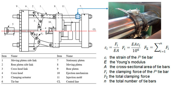 where ε represents the strain of a tie bar in micrometers, E is the Young’s modulus of the tie bar and its value is 210,000 kgf/cm2, A is the cross-sectional area of a single tie bar in mm2, and F is the clamping force in kNs.