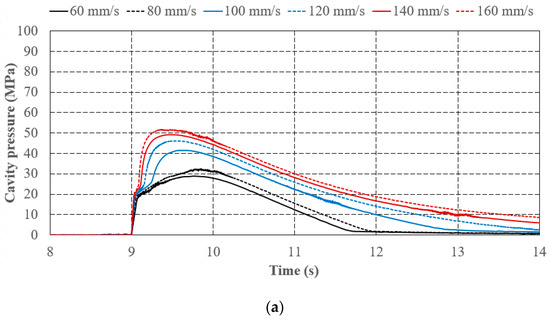 Figure 12a,b show the experimental results of varied injection speeds under identical V/P switchover (referring to screw position at 15 mm) and holding pressure (100 MPa) settings. Notably, these sensed pressure and clamping force increment signals at the starting time have shifted to the same starting time for subsequent comparisons (Figure 12, Figure 13 and Figure 14). Comparing the patterns of measuring profiles obtained by the cavity pressure sensor and the tie-bar strain sensor, the patterns of segments A-B, B-C, C-D are most concerned with the V/P switchover in this study (referring to Section 4.1), and the peak value at point D is visually similar to each other. Figure 12a,b show that a higher pressure that forces the polymer melt to fill in the mold cavity appears when the injection speed is increased at the filling phase. Consequently, the slope at segment A-B becomes sharper with increasing injection speed. If the mold cavity is not volumetrically filled at the holding phase, the slope at segment B-C with respect to varied injection speed changes insignificantly. When the polymer melt compression phase is executed at a low injection speed (60 and 80 mm/s in this case), the slope at segment C-D showing the compression behavior is insignificant, which is classified as Pattern A in Figure 11a. The compression phenomenon is relatively obvious with a higher injection speed (100 and 120 mm/s in this case), which is identified as Pattern B in Figure 11b. Also, the piecewise point C appears earlier because more polymer melt is injected into the mold cavity which is due to a large inertia of injection screw motion in high speed. Besides, the peak pressure appeared at point D is also higher. As the injection speed significantly increases to 140 and 160 mm/s, the sudden compression behavior may lead to overshot and the pattern is similar to Pattern C in Figure 11c. In these cases, the patterns of clamping force increment which successfully reflect the mold separation are similar to those of cavity pressure. Table 3 shows quantitative evidence of the characteristic similarities between cavity pressure and clamping force increments with respect to varied injection speeds. Except for the negative slope of segment B-C in the clamping force increment which is obscured in this study, the other slopes of segments, the peak values of the cavity pressure, and the clamping force increment are all increased with increasing injection speed.