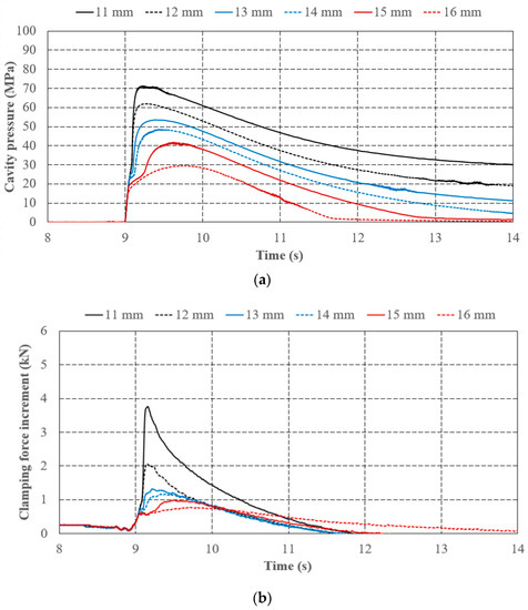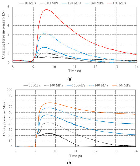 Effects of holding pressure on (a) cavity pressure and (b) clamping force increment.