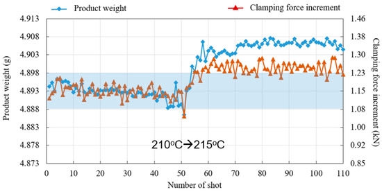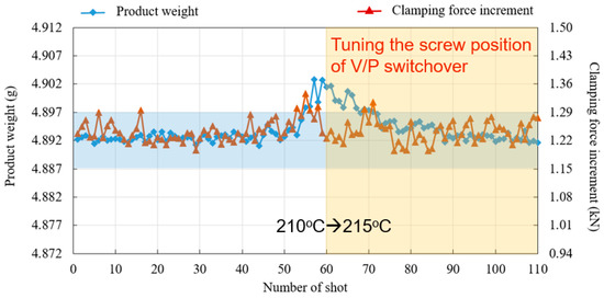 To further prove the feasibility of changing V/P switchover point to part weight, this study conducted an experiment which slightly changed the barrel temperature from 210 °C to 215 °C. The part weight is expected to increase, since a higher barrel temperature enhances the flowing ability of molten polymer when filling the cavity. Figure 16 shows the change of part weight corresponding to varied barrel temperatures, in which both the product weight and clamping force increment increase and run out of the specification (blue block). Figure 17 shows the result of reducing part weight variation with the proposed V/P switchover control method. The screw-position V/P switchover point is further related to the value of the clamping force increment, i.e., when a continuous shot with over clamping force increment is detected, an earlier V/P switchover is performed. In contrast, a later V/P switchover is adjusted. The figure also describes how both the part weight and clamping force increment are tuned back within the specification after a few shots. Furthermore, in a series of barrel temperature variations in a sequence of 210 °C, 215 °C, 210 °C, 205 °C, and 210 °C, Figure 18 shows that the fluctuation of part weight can be successfully reduced with this method, as the original weight range 0.048 g is decreased to 0.027 g.