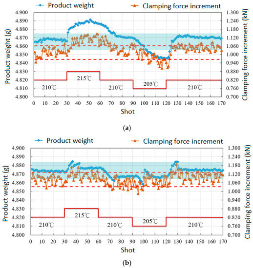 Reduction of part weight variation corresponding a series of barrel temperature change by V/P switchover point referring to clamping force increment: (a) original; (b) control engaged.