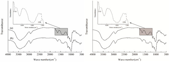 The introduction of PSH substituents and caproates onto starch chains was demonstrated by FTIR spectra of HCS (curve a) and ACS (curve b), as depicted in Figure 1. Besides the characteristic absorption peaks presented in the spectrum of ACS, there showed two new absorption peaks in the spectrum of HCS. The new peak appeared at the wave number of 1733 cm−1 was attributed to the characteristic absorption band of C=O [31] in the caproates, confirming the successful introduction of caproates in the starch molecules. The other one appeared at the wave number of 1204 cm−1 corresponded to the symmetric stretching vibration of sulfonic ions [32], which verified the existence of the PSH substituents on the starch chains.