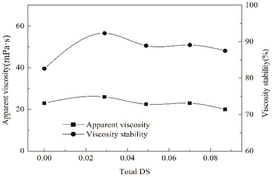 The impact of the PSH substituents and caproates introduced onto ACS chains upon apparent viscosity and its stability of cooked ACS paste is showed in Figure 3. As found, after the introduction of the two substituents, the paste viscosity did not show an obvious difference with that of the ACS (DS = 0) and HS (DS = 0.029). In addition, with the increases in DS values, i.e., the amounts of the PSH substituents and caproates introduced, the variation of the viscosity was unobvious. Moreover, the HCS samples were superior to their counterpart ACS in the stability of paste viscosity but were inferior to HS sample in stability. As the total DS raised, the stability exhibited a decreased tendency. It suggested that the introduction of caproates led to a negative impact on the stability. Fortunately, in the total DS range of 0.049–0.087, the stability was above 85%. In general, the viscosity stability of the paste required is ≥ 85% during its use in sizing [34]. Consequently, the introduction of the substituents can meet with the demand on the stability for warp sizing.