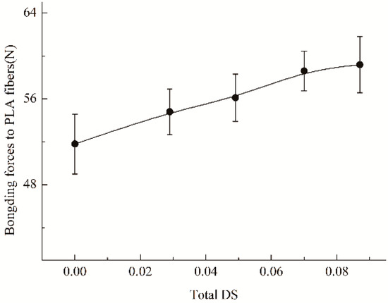 As is well known, adhesion of sizing or coating agents to fibers displays the effect of increasing the strength of fibrous goods by bonding the fibers together. Hence, the impact of hydroxypropylsulfonation/caproylation on the adhesion should be estimated, and the results as a function of DS value of the substituents, the average number of the substituents introduced per anhydroglucose unit of starch, are represented in Figure 4. It could be found that HCS was superior to HS (total DS = 0.029) and ACS (total DS = 0) in the bonding forces to PLA roving. This observation implies that hydroxypropylsulfonation/caproylation is not only able to obviously improve the adhesion of ACS to PLA roving but also capable of further ameliorating the adhesion of HS to PLA roving. The forces of HCS were correlated with the total DS. As the DS increased, the forces gradually increased, and when the DS was above 0.070, the force just had a slight increase.