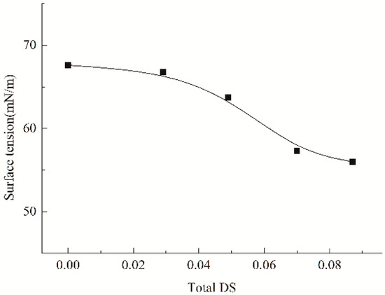 Obviously, the substituents introduced can interfere with the re-association of the hydroxyls and alleviate the parallel arrangement of the amyloses through their steric hindrance, thereby favoring to alleviate the retrogradation [14]. As a result, an amelioration in the wetting and spreading may be expected. Furthermore, as broadly accepted, wetting and spreading abilities of an adhesive liquid onto a given solid surface is correlated with its surface tension [30]. A reduced tension favors the wetting and spreading, and often induces an improved adhesion [44]. For the reason, the impact of caproates and PSH substituents on the surface tension of cooked starch paste was measured, as depicted by indicating the tension versus total DS values in Figure 5. It was observed that the two substituents gave much impact on the tension, and the tension decreased after the introduction of the two substituents. The tension depended on the total DS, and it gradually reduced in the DS range of 0.049–0.087. In addition, the HCS pastes had lower tension than ACS and HS had. This means that caproates and PSH substituents are both necessary to provide the derivatives with stronger surface activity. A decreased tension also favors to ameliorate the wetting and spreading of cooked starch pastes onto the fiber surfaces. The amelioration will lower the probability of interfacial failure mentioned above, providing an improvement in the adhesion. Apparently, the hindrance of caproates and PSH substituents is larger than that of PSH substituents, subsequently exhibiting a stronger obstruction to the re-association and a greater alleviation in the arrangement. Additionally, the HCS paste has a lower surface tension compared to the HS paste. Therefore, the HCS is superior to HS in the adhesion. Besides, hydrophobic caproates that contain ester groups will favor to increase the van der Waals force at the interfaces between starch adhesive layers and PLA fibers, due to the chemical similarity with the carbonyls in PLA molecular chains, thereby also favoring the improvement the adhesion. These factors reinforce the interfacial actions and provide a positive effect on the adhesion. However, the introduction of the hydrophobic caproates will reduce the water-dispersibility of starch, which can be evaluated by the measurement of the light transmittance of the paste, as depicted in Figure 6. As seen, with the increase from 0.029 to 0.087 in the total DS (from 0 to 0.058 in the DSc of the caproates introduced), light transmittances of the starch pastes gradually decreased. Commonly, the lower the transmittance, the worse the water-dispersibility [45]. Therefore, it can be concluded that water-dispersibility of the HCS paste continuously reduces as the amount of the caproates increases. It has been demonstrated that the worse water-dispersibility leads to incomplete wetting and outspreading [15], thereby resulting in the occurrence of the interfacial failure and generating an adverse effect on the adhesion. Therefore, the combination of the positive and negative factors may be expected to reduce the probability of interfacial failure, favoring the adhesion. Based on the reduced probability, the adhesion of the HCS to fibers will increase if the cohesive force of the HCS adhesive layer is strong enough.