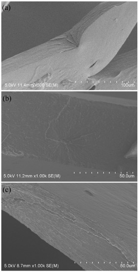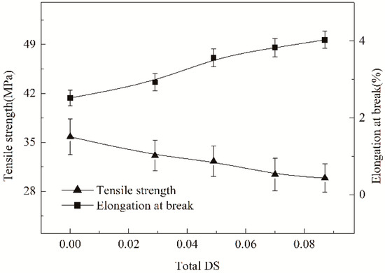 In general, the cohesive failure of an adhesive joint is also correlated with the mechanical properties of the adhesive layers existed among fibers [25]. Accordingly, the properties should be investigated for the estimation of the cohesive failure. Nevertheless, it should be clearly noted that it has considerable difficulty to strip the adhesive layers among fibers for determining the real mechanical properties of the layers. Fortunately, the HCS films cast from cooked HCS pastes are capable of being adopted to estimate the properties such as tensile strength, elongation at break, degree of crystallinity and flexibility. The tensile strength and elongation at break are determined and shown in Figure 7. Compared with ACS film, the strength of the HCS films decreased, but the elongation increased. The strength and elongation depended on the total DS. In addition, with the rise in the total DS, the elongation gradually promoted whereas the strength continuously lowered. This observation suggests that the hydroxypropylsulfonation/caproylation can reduce the brittleness of starch films or adhesive layers, exerting a toughening effect on the films or adhesive layers. The toughening effect provided by the modification can be verified by observing the SEM images of the cross-section of ACS, HS and HCS film samples, as represented in Figure 8a–c, respectively. It could be seen from Figure 8a that ACS film exhibited a strong brittleness while HS and HCS films displayed a lower brittleness seen from Figure 8b and c, respectively. This observation means that the hydroxypropylsulfonation/caproylation produces a toughening effect on the film. Undoubtedly, the HCS film (described as HCS adhesive layers that formed among PLA fibers) with a lower brittleness is preferable to the brittle ACS film for the improvement of the adhesion, so as to promote the applications of HCS in warp sizing and surface coating.