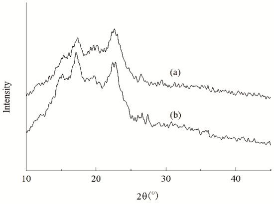 During the formation of the film or the adhesive layer, the amylose chains in the aqueous paste regularly arrange with each other by hydrogen bonding between the hydroxyls and form a three-dimensional network structure [46]. It is the most important reason that starch film exhibits a strong brittleness and cannot produce a large deformation. The PSH substituents and caproates act like the wedges between starch chains through their hindrance. Consequently, the substituents favor disturbing the arrangement in an orderly way of the amyloses during film or adhesive layer formation. As a result, a lowered degree of crystallinity ascertained by X-ray diffraction of the starch film can be expected and is depicted in Figure 9. Compared with X-ray diffractogram of ACS film, the HCS film was smaller than ACS film in the areas of crystalline regions. It implies that the HCS film has a lower crystallinity, which is mainly attributed to the hindrance of the substituents introduced diminishes the inter-chain hydrogen bonding and exhibits the disturbance to the regular arrangement of starch chains, subsequently lowering the formation of the crystalline structure. Furthermore, the hindrance of the two substituents can also provide an internal plasticization for the layers. Consequently, a higher elongation and a lower strength for the HCS film are displayed. Undoubtedly, an adhesive layer with a lower brittleness will avoid the occurrence of strong internal stresses in the layer, thereby diminishing the probability of cohesive failure within the matrix of the adhesive layer, and favoring the adhesion.